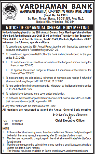 NOTICE OF 35th ANNUAL GENERAL BODY MEETINGNotice is hereby given that the 35th Annual General Body Meeting of shareholders of the Bank will be held on Thursday 8th of August, 2024, at 4.00 p.m. at Kutchi Bhavan, 3-5-141/2/A/1, Ramkote, Hyderabad- 500001 to transact the following business.